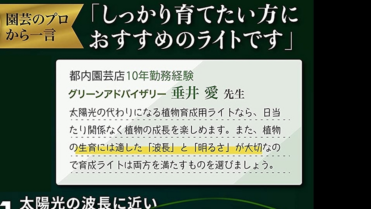それと、この育成ライト、実はインスタのフォロワー2万人超えのグリーンアドバイザー「垂井愛(たるいあい)」さんが企画段階から参画されていて、試作品も使用された上で推薦されているライトみたいなんですよね。なので、怪しい会社のライトだと思っている方は安心して大丈夫です。