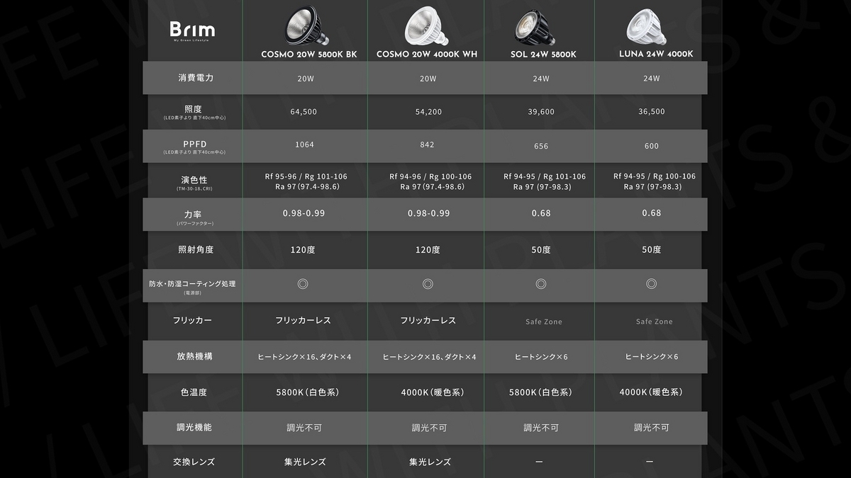 次にスペック表がこちらです。比較しやすいように、SOLとLUNAも一緒にご覧ください。左から順に、コスモのブラック、ホワイト、そしてSOL、最後がLUNAですね。ポイントとしては、まずはコスモの消費電力は20Wですね。照射距離40cmの照度はブラックの方が約1万ルクスも高いところ。照射距離40cmのPPFDもブラックは1064で、ホワイトより高いですね。演色評価数Raも97と高めなのでライトを照らした植物やアクアリウムではきれいに見えると思います。照射角度は120度とかなり広いですね。あと放熱機構はSOLやLUNAより放熱効率がアップしていますね。さいご、レンズは脱着可能になっております。